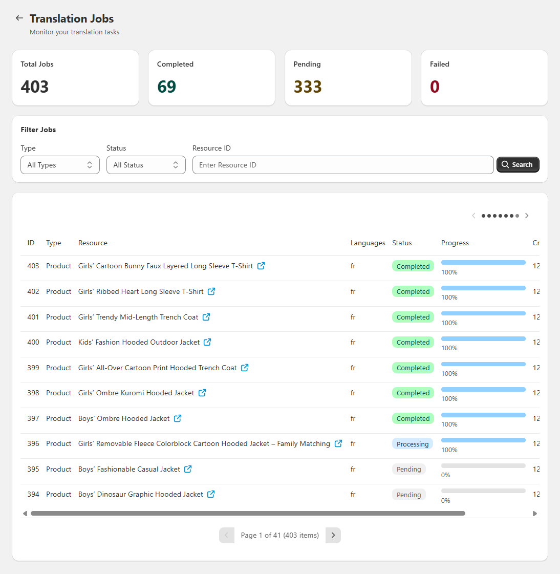 Monitor translation jobs in real-time. Track progress, view history, and manage all your translations.